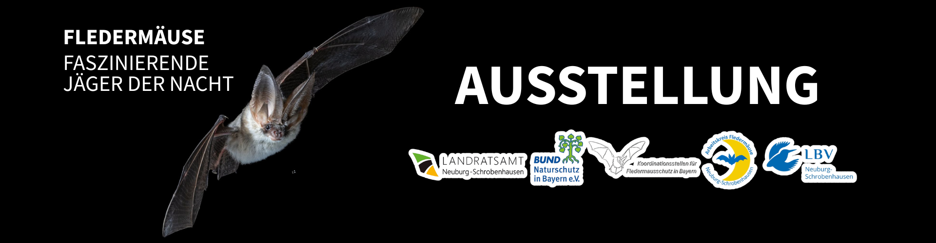 Bald sind die nächtlichen Flugkünstler im Landratsamt zu finden. Im Rahmen der Ausstellung „Fledermäuse – Faszinierende Jäger der Nacht“, die vom 17.04. bis 12.06. im Neuburger Landratsamt besichtigt werden kann, strickt sich ein abwechslungsreiches Programm – egal ob für Groß oder Klein.