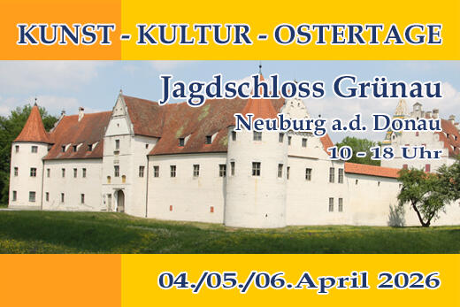 Das bezaubernde Anwesen liegt etwa 5 km östlich von Neuburg an der Donau im größten zusammenhängenden Auwaldgebiet Mitteleuropas. Die "Kunst, Kultur & Ostertage" lassen das Jagdschloss Grünau in neuem Licht erstrahlen. Zahlreiche Künstler und Aussteller aus den Bereichen Wellness, Garten- und Biokultur, internationalem Kunsthandwerk und mit der nötigen "Liebe zum Detail" heißen Sie herzlich willkommen- Auch Ausstellungen und Vorträge, Reit- bzw. Kutschvermietungen sind auf dem einzigartigen Gelände des Jagdschlosses durchaus vorstellbar. Das romantisch gelegene Jagdschloss Grünau hatte bereits in den letzten Jahren bei ähnlichen Veranstaltungen einen sehr großen Zulauf und glänzt nun in neuer Form durch aufwendige Renovierungsarbeiten.