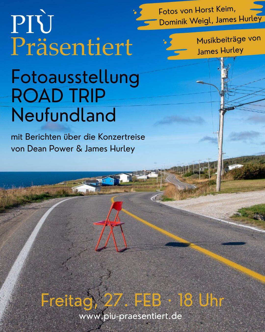 Die Ausstellung zeigt eindrucksvolle Momentaufnahmen einer besonderen Reise durch Neufundland. Gezeigt werden Fotografien von Horst Keim, Dominik Weigl und James Hurley von ihrer gemeinsamen Reise an diesen magischen Ort im Herbst 2025. Anlass dafür war die Konzerttournee von Dean Power und James. Berichte und Fotos geben Einblicke in das Leben on the road – zwischen Musik, Menschen und Orten. Musikalische Beiträge von James begleiten den Abend und schaffen eine atmosphärische Verbindung zwischen Bild, Klang und Geschichte.